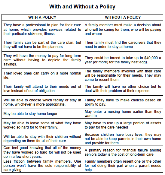 The #1 reason given for buying LTC insurance is to not be a burden on family and friends. There are many ways that LTC insurance will protect your family and friends.